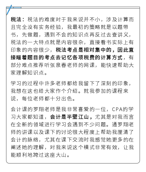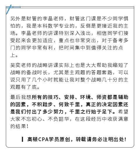 作为一个财务小白,也没有相关工作的从业经验,报考CPA最初实际是个机缘巧合的选择,想要报考时连CPA六门考试的科目名称都不知道,仅仅是听说考试的难度很大,考虑到自身跨行业的情况,希望有一个更好的基础,同时也是一个系统培训的过程。因此经过一番其他了解后,选择了脱产学习,全力争取一次通过6科。
