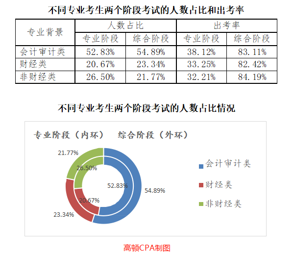 从以上表格能够很明显可以看出,会计审计类、财经类专业考生占据绝大部分,达到了73.50%。非财经类考生也超过了总数的1/4,说明通过报考注册会计师跨专业转行的人士还是相当多的。