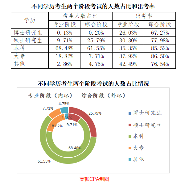 无论是专业阶段还是综合阶段,本科学历考生占据比例都是最多的,分别占到了68.48%,61.55%。硕士研究生和博士研究生报考人数相对较少,排在第二的是专科学历考生,这大概是与很多考生所想的学历不够,证书来凑有关系吧。