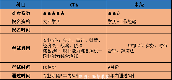 从考试科目上来看,中级的《中级会计实务》、《财务管理》、《经济法》分别对应了CPA的《会计》、《财务成本管理》、《经济法》,二者在考试科目上有着非常高的关联度,包括各科的知识点。区别在于中级会计考查知识点相对较基础,考试难度较低,CPA考试知识范围覆盖较广,考查更深。