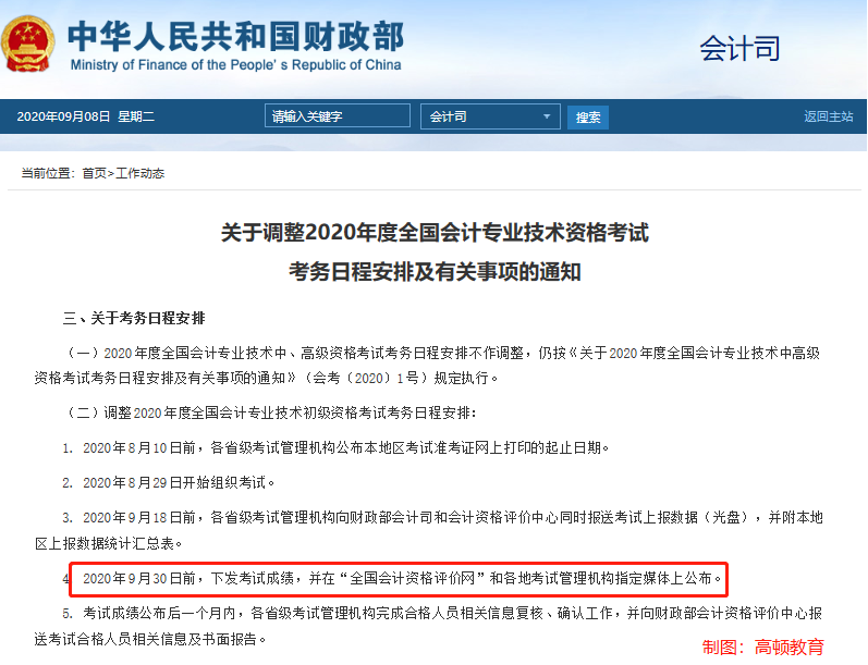 2020年9月30日前,下发考试成绩,并在“全国会计资格评价网”和各地考试管理机构指定媒体上公布。