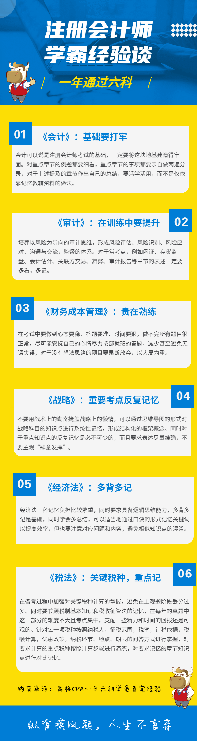 最后,注册会计师一年通过六门考试有难度,如果打算一年通过全部科目,需要做好类似当年高考那样,埋头学习一年的准备。相信,功夫不负有心人。
