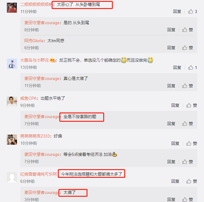 因为第一批的《税法》考试可以说还是很友好的,加上第二批次上午场《会计》考试难度不大,出乎意料地接到下午的《税法》,考生们傻眼了,他们究竟看到了什么?