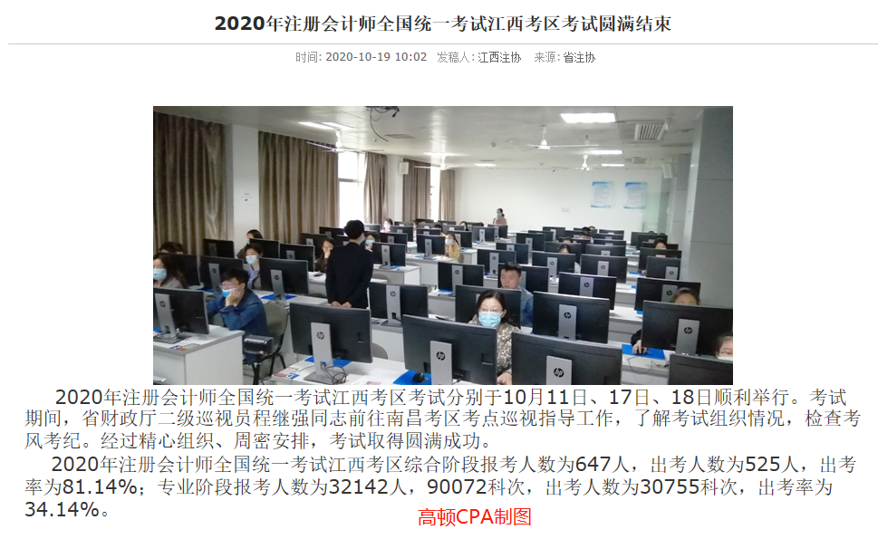 2020年注册会计师全国统一考试江西考区综合阶段报考人数为647人,出考人数为525人,出考率为81.14%;专业阶段报考人数为32142人,90072科次,出考人数为30755科次,出考率为34.14%。