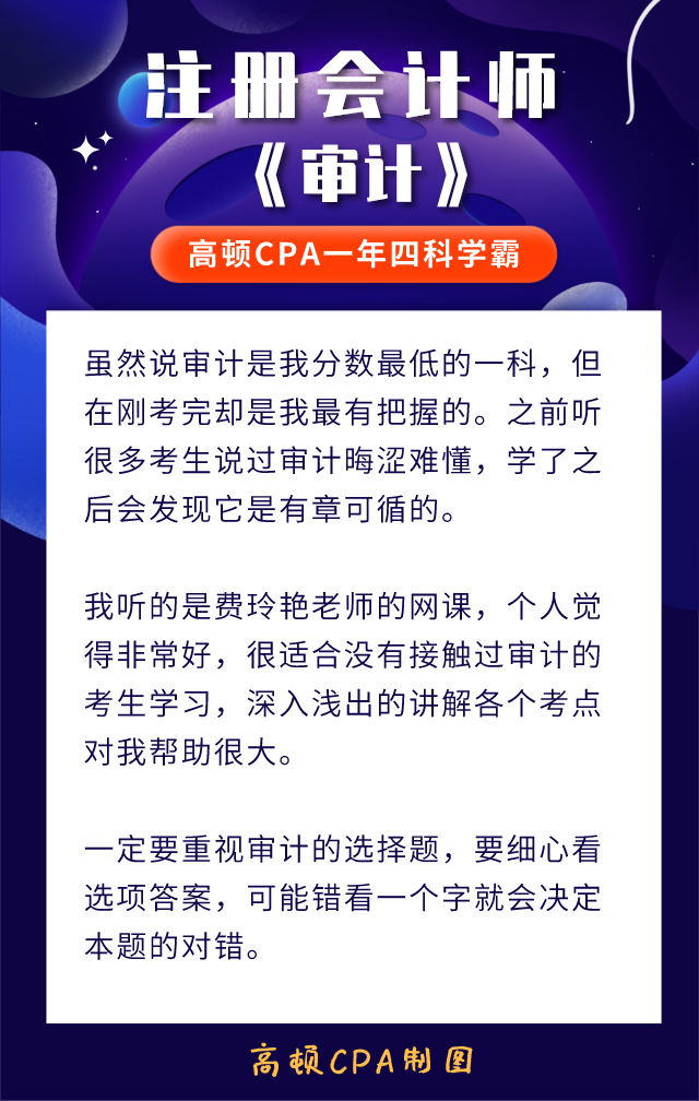 注会的《审计》科目具有很强的逻辑性,考生需要多做题,理解题目考点,注意关键词,形成自己的一套做题逻辑,通过的可能性是很大的。