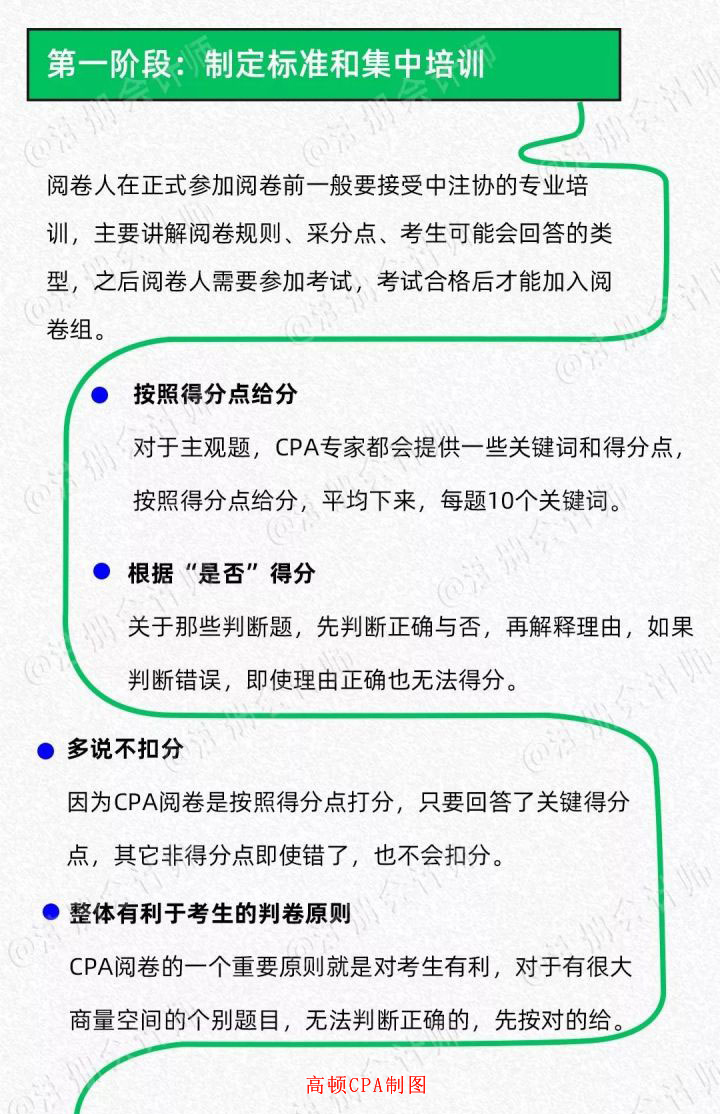 一般来说,CPA成绩的阅卷流程包括前期的制定标准阶段以及后面的正式阅卷阶段。两阶段具体内容有: