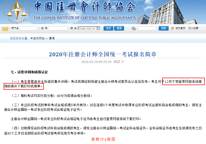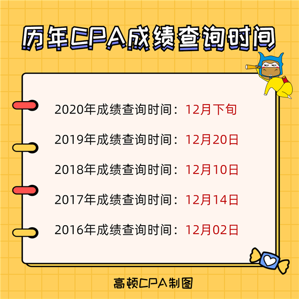 2019年CPA成绩公布也是12月下旬,而成绩具体的公布时间是在12月20日,也是下旬的第一个工作日。如果按照这种猜测的话,2020年成绩公布时间很有可能是下旬的第一个工作日,也就是12月21日。