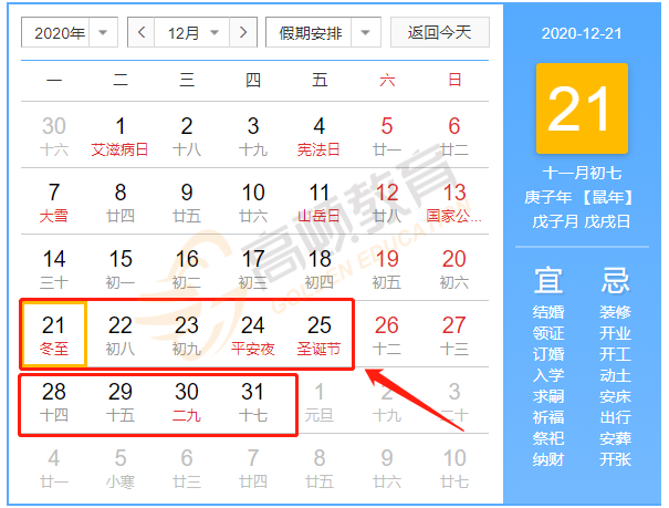而2020年12月下旬的工作日有这么几个: