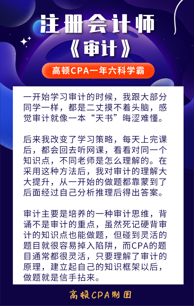 关于CPA《审计》究竟该怎么学?高顿CPA历届学员给出了学习建议,各考生可以参考: