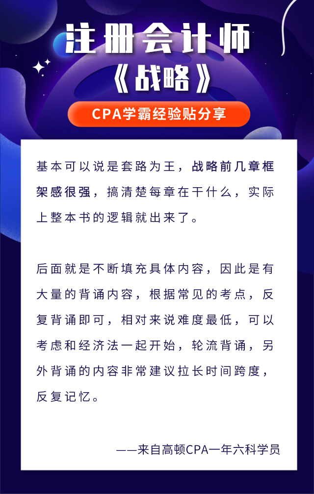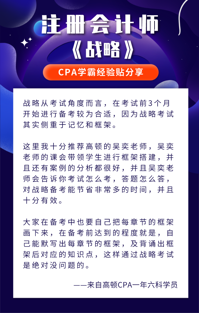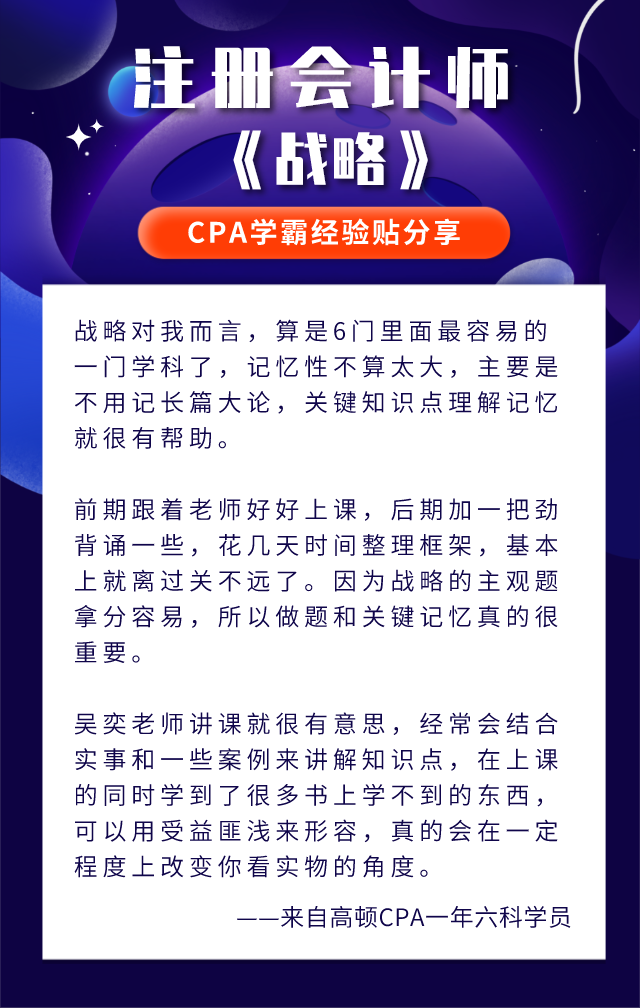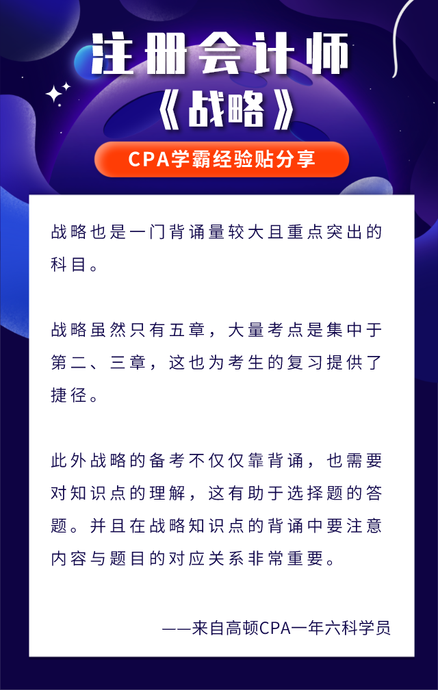 虽然说是注会专业阶段最简单科目,高顿CPA老师提醒大家依然不能掉以轻心。关于《战略》的学习技巧,高顿CPA老师整理了一些历届学霸的经验,准注会考生们可以参考!